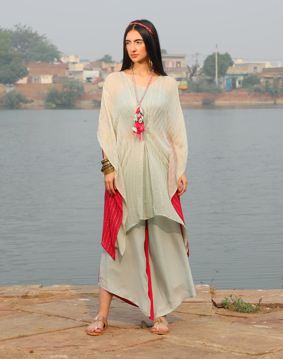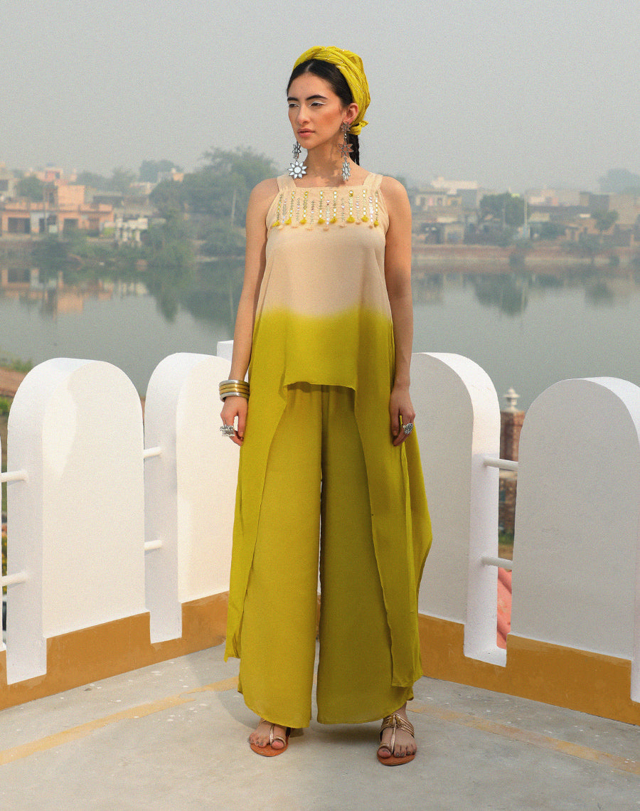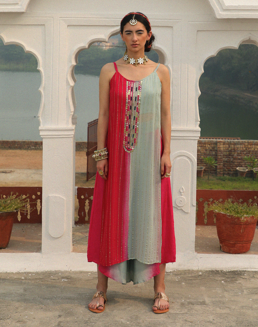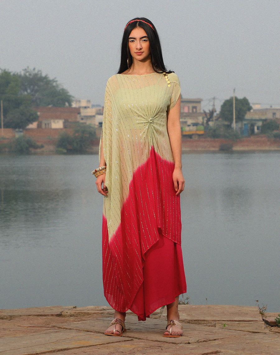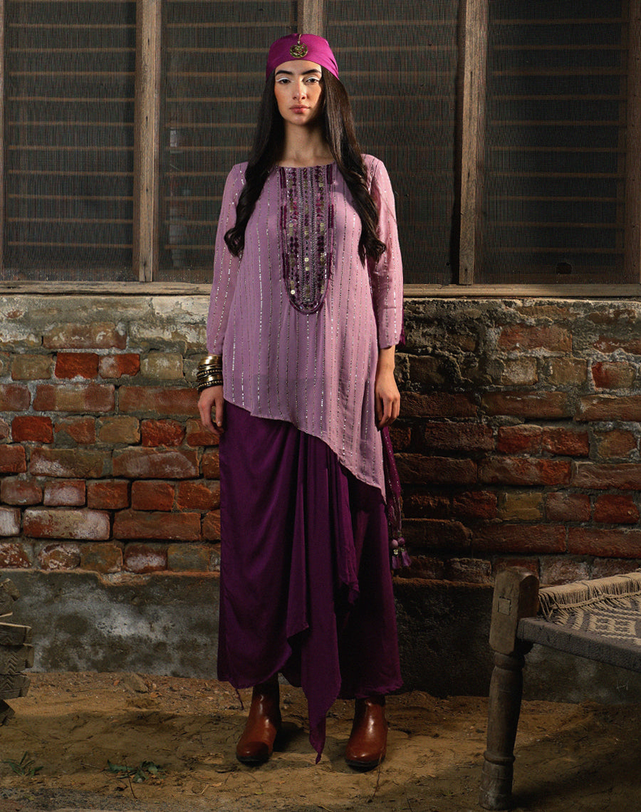 3 layered Shimmer tunic with dense mirror and thread embroidery paired with tapered pants.