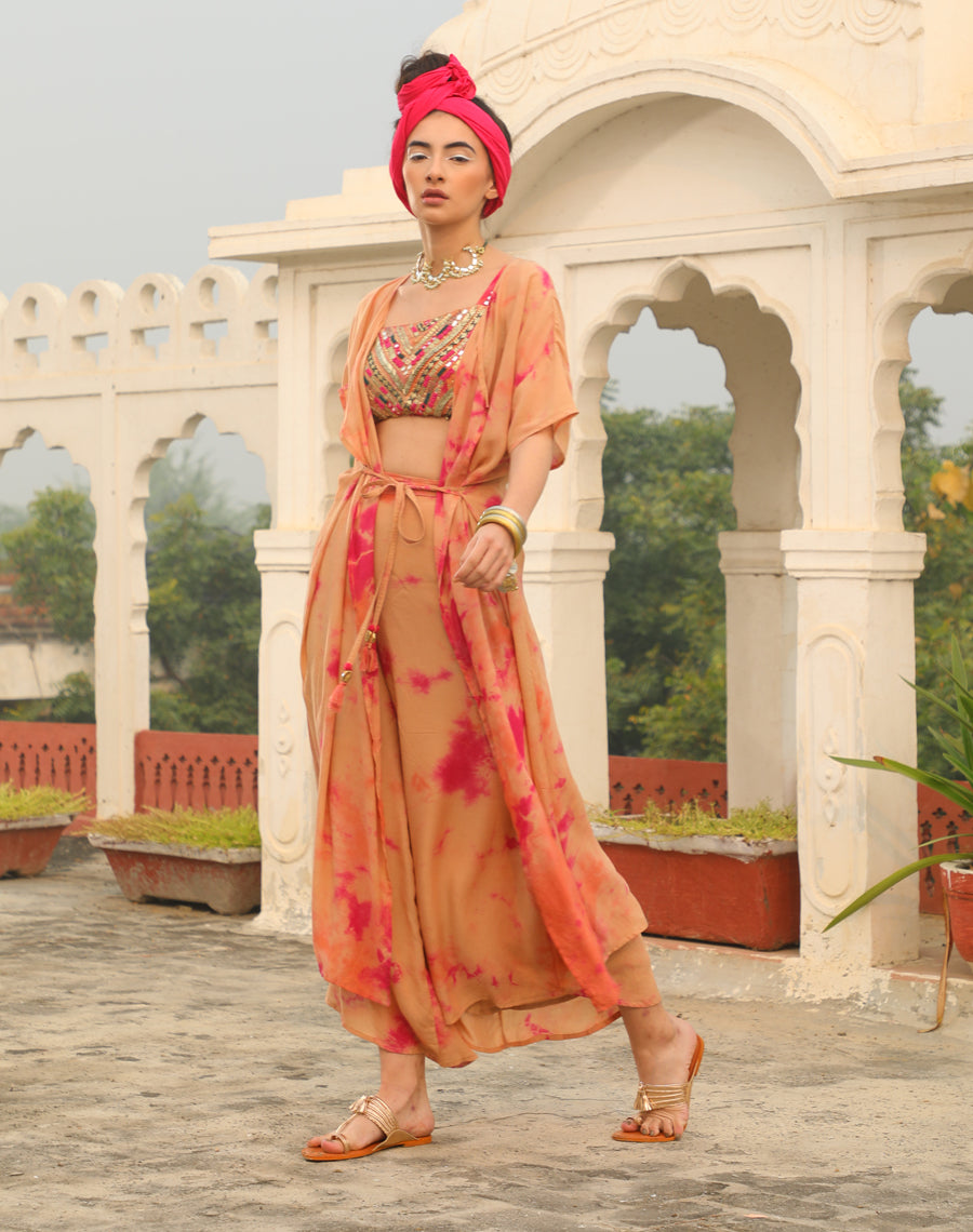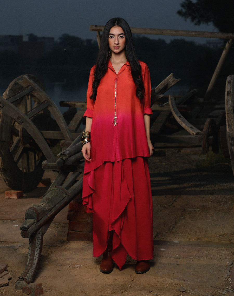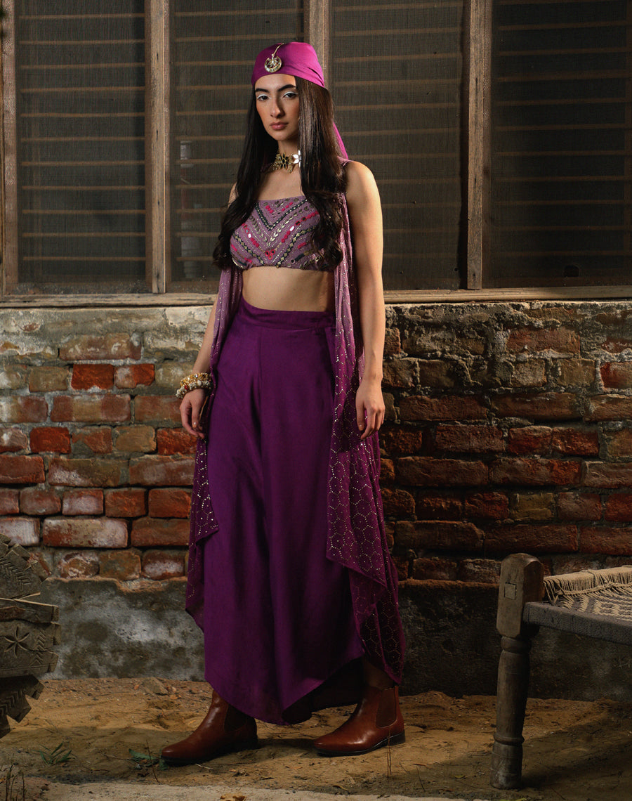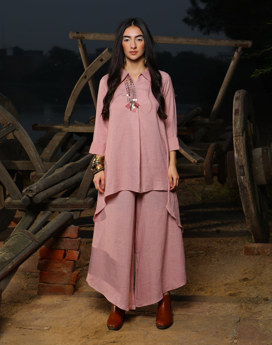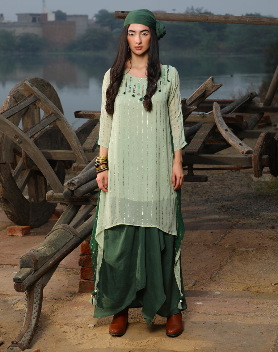 3 layered Shimmer tunic with dense mirror and thread embroidery paired with tapered pants.