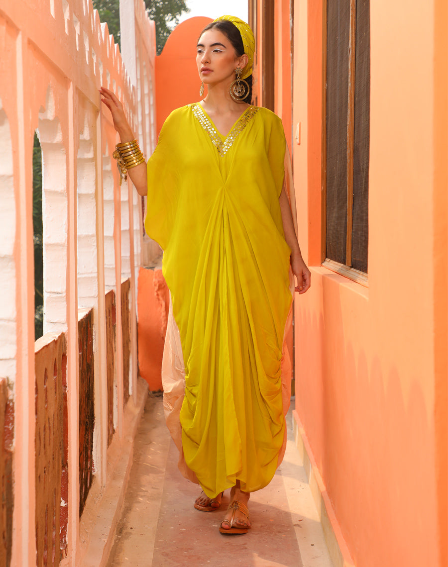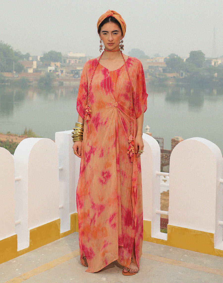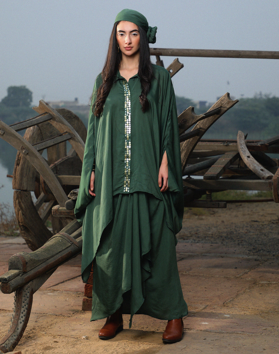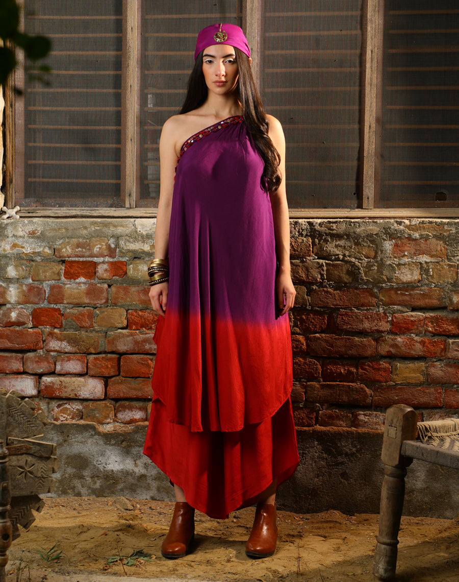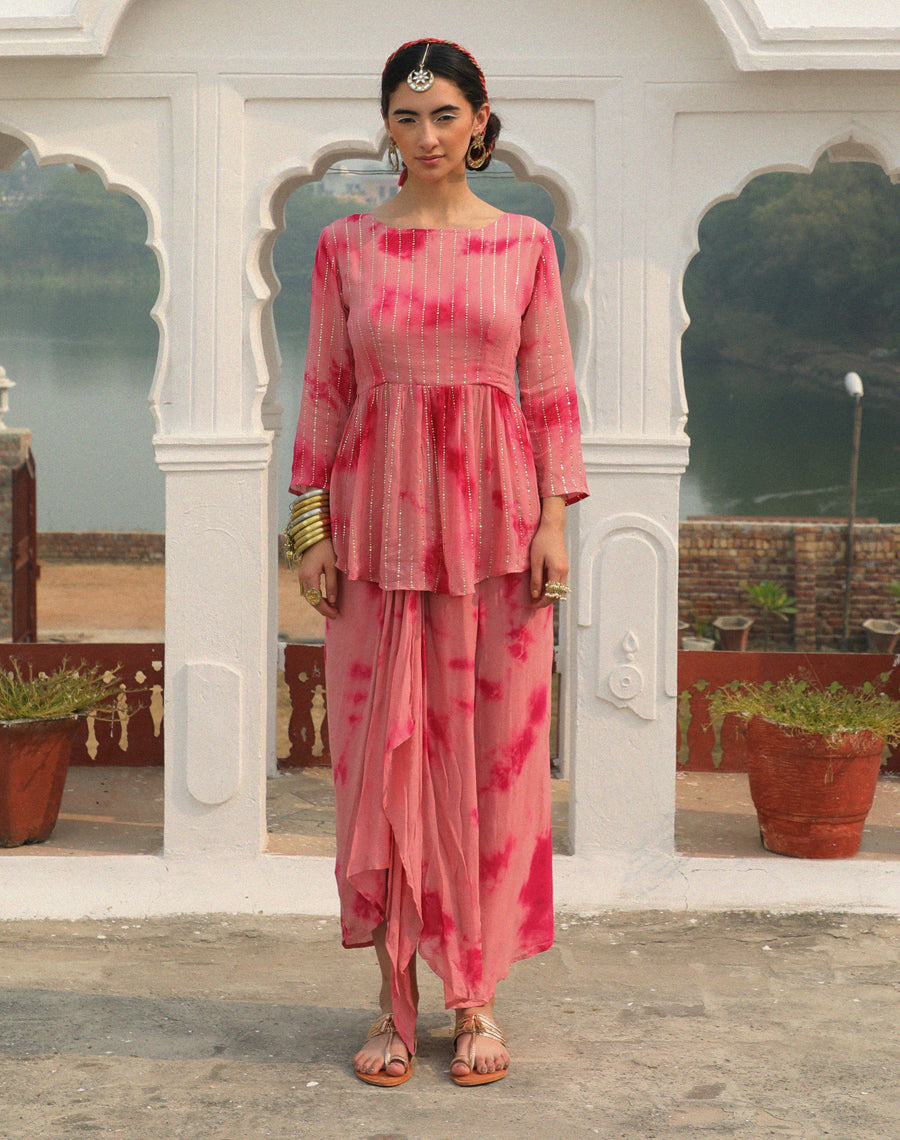 3 layered Shimmer tunic with dense mirror and thread embroidery paired with tapered pants.