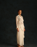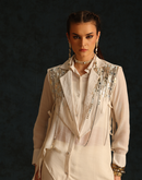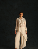 Assymetric shirt with a cape blazer waistcoat embellished with silver metallic embroidery paired with an assymetric pant