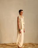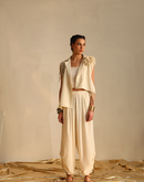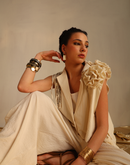 Dramatic flower blazer embellished with threadwork tassels on shoulder paired with a cargo pant