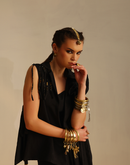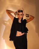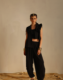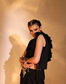 Frill blazer embellished with threadwork tassels on shoulder paired with a cargo pant
