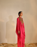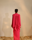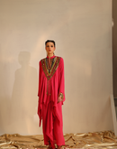 Yoke gather flared top embellished with multi-coloured and metallic paired with a draped skirt