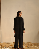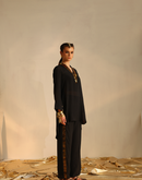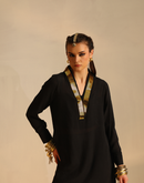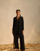 Overlap collar tunic embellished with foil lace paired with a pallazo pant-