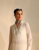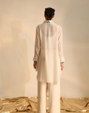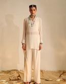 Overlap collar tunic embellished with foil lace paired with a pallazo pant