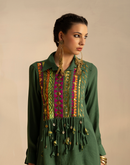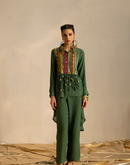 Waterfall with boho patch embellished with metallic embroidery and tassels paired with a pallazo pant
