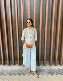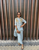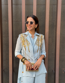 Waterfall shirt with a cape blazer waistcoat embellished with golden metallic embroidery paired with an assymetric pant