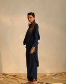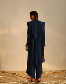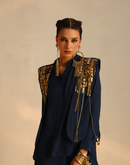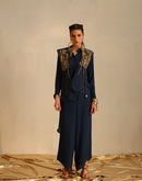 Waterfall shirt with a panel waistcoat embellished with golden metallic embroidery paired with an assymetric pant