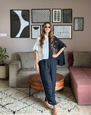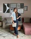 Half & Half flared flared shirt with long pocket embellished with metallic coins & chains paired with a palazzo pant
