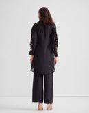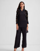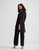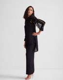 Shawl collar tunic with tassels & metallic embellishments paired with a pallazo pant