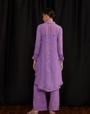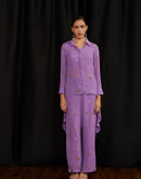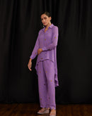 Waterfall shirt set embellished with metallic coins all over paired with a pallazo pant