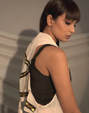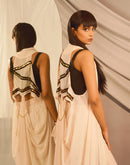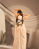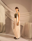 Bias shimmer jacket with mettallic embellishments in the front and back. Paired with a bralet and pallazos.