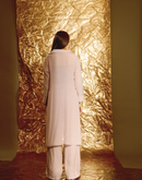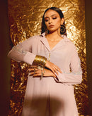 Long blazer tunic with metallic and unicorn sequin embellishment. Paired with pallazo pants and a bralet.