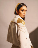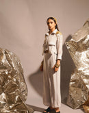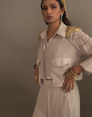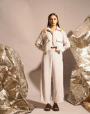 Crop shirt with long pockets paired with pallazo pants. The set is embellished with shimmery gold patch and chains on the shoulders.