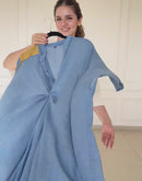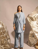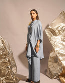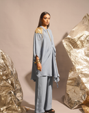 Tuck kaftan embellised with shimmery gold patch on the shoulder with hanging chains paired with Pallazos.