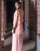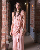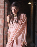 Skirt saree with shimmer dupatta and a double peplum top embellished with metallic embroidery and tassels.