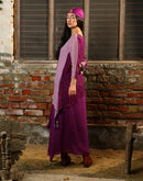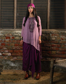 Asymmetric tunic paired with drape skirt, embellished with dense mirror and thread embroidery. Lavender front and purple back.