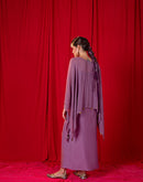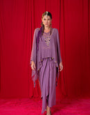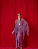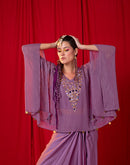 Shimmer georgette cape embellished with metallic and mirror embroidery paired with a draped skirt.