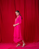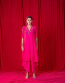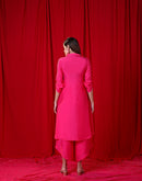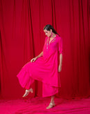 V blazer collar tunic embellished with metallic and mirror embroidery paired with an asymmetric palazzo pant.