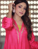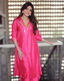 V blazer collar tunic embellished with metallic and mirror embroidery paired with an asymmetric palazzo pant.