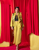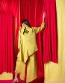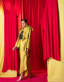 Asymmetric shirt with a dramatic frill on the shoulder, paired with asymmetric palazzo pants and black khadi bustier embellished with metallic coins.