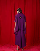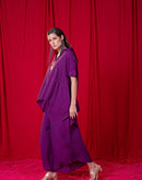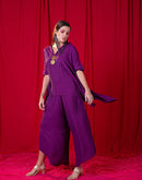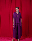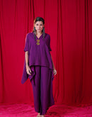 Kimono top with bias panel, embellished with big metal coins paired with an asymmetric palazzo pant.