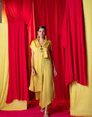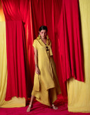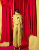 Long and short top paired with asymmetric palazzo pants, embellished with big metal coins.