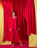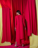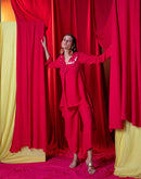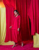 High-low shirt with a dramatic collar emebllished with unicorn sequins paired with an asymmetric palazzo.
