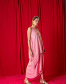 Shimmer georgette tunic embellished with neon thread, metallic and mirror embroidery paired with a draped skirt.