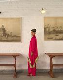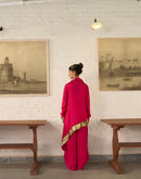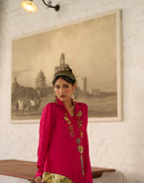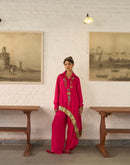 Asymmetric placket shirt paired with an asymmetric pallazo pant . The shirt is embellished with silver and gold ornaments and antique gota on the border.