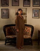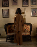 Shirt paired with a straight pallazo pant. The shirt is embellished with metallic coins and feather on the shoulder and the set has gold and silver dots all over.