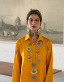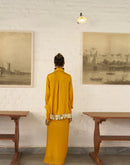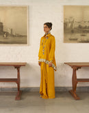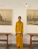 Inverted U-Hem shirt paired with a Drape Skirt. The shirt is embellished with silver and gold ornaments and antique gota on the border.