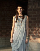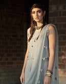 Dhoti saree with a shimmer dupatta and flare top embellished with metallic geometric embroidery ending with multi-colored tassels.