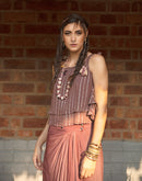 Shimmer double layer top with a drape cowl wrap-around skirt paired with a handmade necklace.