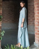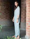 Tunic with metallic embroidery and self-colored tassels paired with asymmetric pants.