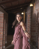 Top with metallic embroidery and multi-colored tassels paired with asymmetric pants which has attached frill dupatta.
