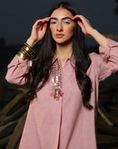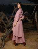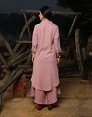 Linen Shirt paired with asymmetric pants embellished with mirror work detailing.